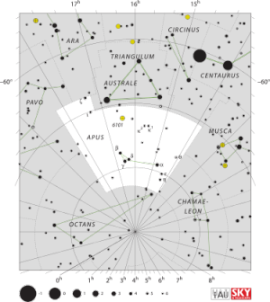 Apus is a faint constellation in the southern sky, first defined in the late 16th century. Its name means "no feet" in Greek, and it represents a bird-of-paradise (which were once believed to lack feet). It is bordered by Triangulum Australe, Circinus, Musca, Chamaeleon, Octans, Pavo and Ara. Its genitive is "Apodis". The most prominent deep-sky objects in Apus include the globular clusters NGC 6101 and IC 4499 as well as the spiral galaxy IC 4633.