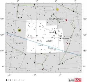 Aries has three prominent stars forming an asterism, designated Alpha, Beta, and Gamma Arietis by Johann Bayer. All three are commonly used for navigation.There is also one other star above the fourth magnitude, 41 Arietis. α Arietis, called Hamal, is the brightest star in Aries. Its traditional name is derived from the Arabic word for "lamb" or "head of the ram" (ras al-hamal), which references Aries's mythological background.[1]