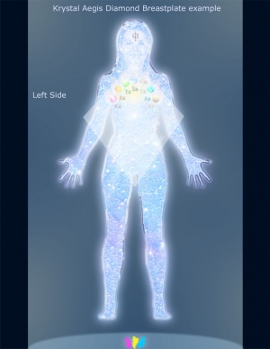The Krystal Aegis (KA) breastplate purpose is to prepare the body to receive the seven core Krystala tones in the Double Diamond Sun Body, and to set the inner foundation to build out the Aurora re-encryption and activate the crystal gems in the Krystal Aegis breastplate to activate these seven tones to protect the physical body, diamond heart and soul bodies. These rainbow pastels are moving lights of frequency that source from the Aurora Krystal diamond light, that move in specific symmetrical patterns as a reaction to the Krystal consciousness mirror, a double diamond ball-sphere, when they are being connected with and observed. The following meditation is to build the Krystal Aegis breastplate in one's aura for core spirit protection and Aurora Re-encryption.[7]