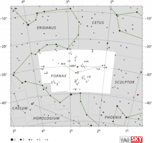 Fornax is a constellation in the southern sky. Its name is Latin for furnace. It was named by French astronomerNicolas Louis de Lacaille in 1756. Fornax is one of the 88 modern constellations.Alpha Fornacis is a binary star that can be resolved by small amateur telescopes. The primary is a yellow-tinged main-sequence star of magnitude 3.9 and the secondary is a yellow star of magnitude 6.5; the secondary may actually be a variable star. It has a period of 300 years and is 46 light-years from Earth. Beta Fornacis is a yellow-hued giant star of magnitude 4.5, 169 light-years from Earth.