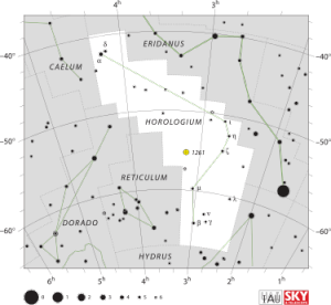 Horologium is a small and faint constellation in the southern sky (declination around −60 degrees). Its name is a Latintransliteration of the Greek word for clock (ὡρολόγιον, "the hour-teller" from ὥρα hṓra "hour and -λόγιον -logion, "teller"). The constellation was devised by French astronomer Nicolas Louis de Lacaille in 1752, and it remains one of the 88 modern constellations. Horologium was one of 14 constellations created by Abbé Nicolas Louis de Lacaille during his expedition to the Cape of Good Hope.[2] He originally labeled it Horologium Oscillitorium, the Latin name for a pendulum clock, to honour its inventor Christiaan Huygens and his book Horologium Oscillatorium.