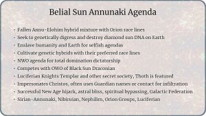 When these False Alien Gods waged their Luciferian Rebellion and subsequent invasion strategies of conquering planet Earth, these self-anointed Gods got to work on devising the various Alien Hybridization programs filled with genetic experimentation, Social Engineering and religious mind control methods to generate consciousness slaves on Earth. The primary life designer for the Belial Group, Sa’am-Enki began the first of many genetic experiments for cloning and hybridization breeding programs from the large elongated skulls of his future Sirian Annunaki progeny of Nephilim with red hair, to the earlier seeding of Neanderthals, which are remnants of his previous Enki life designs for seeding Anti-Christ species. The main purpose to seed Anti-Christ species on the planet is to design them to be the natural enemies of the already existing indigenous population, namely the Essene Christos races, in which they would constantly be manipulated to instigate war and genocidal hatred in order to finally destroy all remnants of Diamond Sun DNA existing within the Earth population. See Sirian Annunaki. [3]