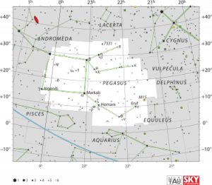 Covering 1121 square degrees, Pegasus ranks 7th of the 88 constellations in size. Pegasus is bordered by Andromeda to the north and east, Lacerta to the north,Cygnus to the northwest, Vulpecula, Delphinus and Equuleus to the west, Aquarius to the south and Pisces to the south and east.